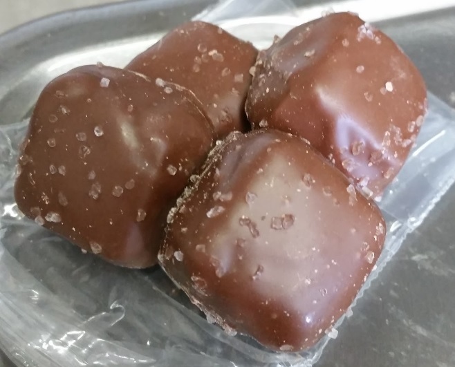 The next item on my review were these delicious small caramel-filled creamy chocolates topped with sea salt. Holy cow! With a swift bite into one of these guys, my mouth was filled with the sweet goodness of chocolate and caramel mixed with a salty bite that balanced perfectly!