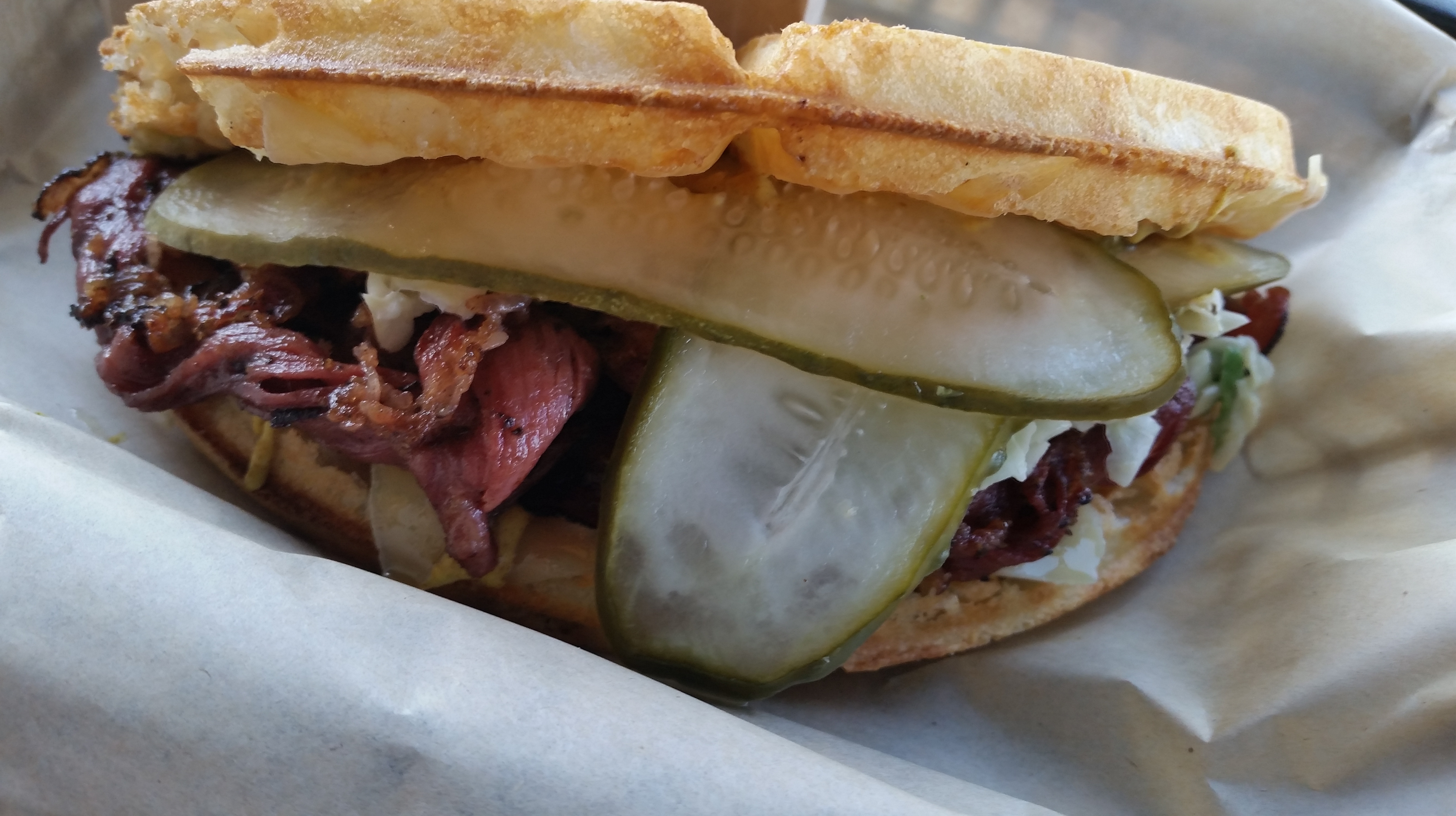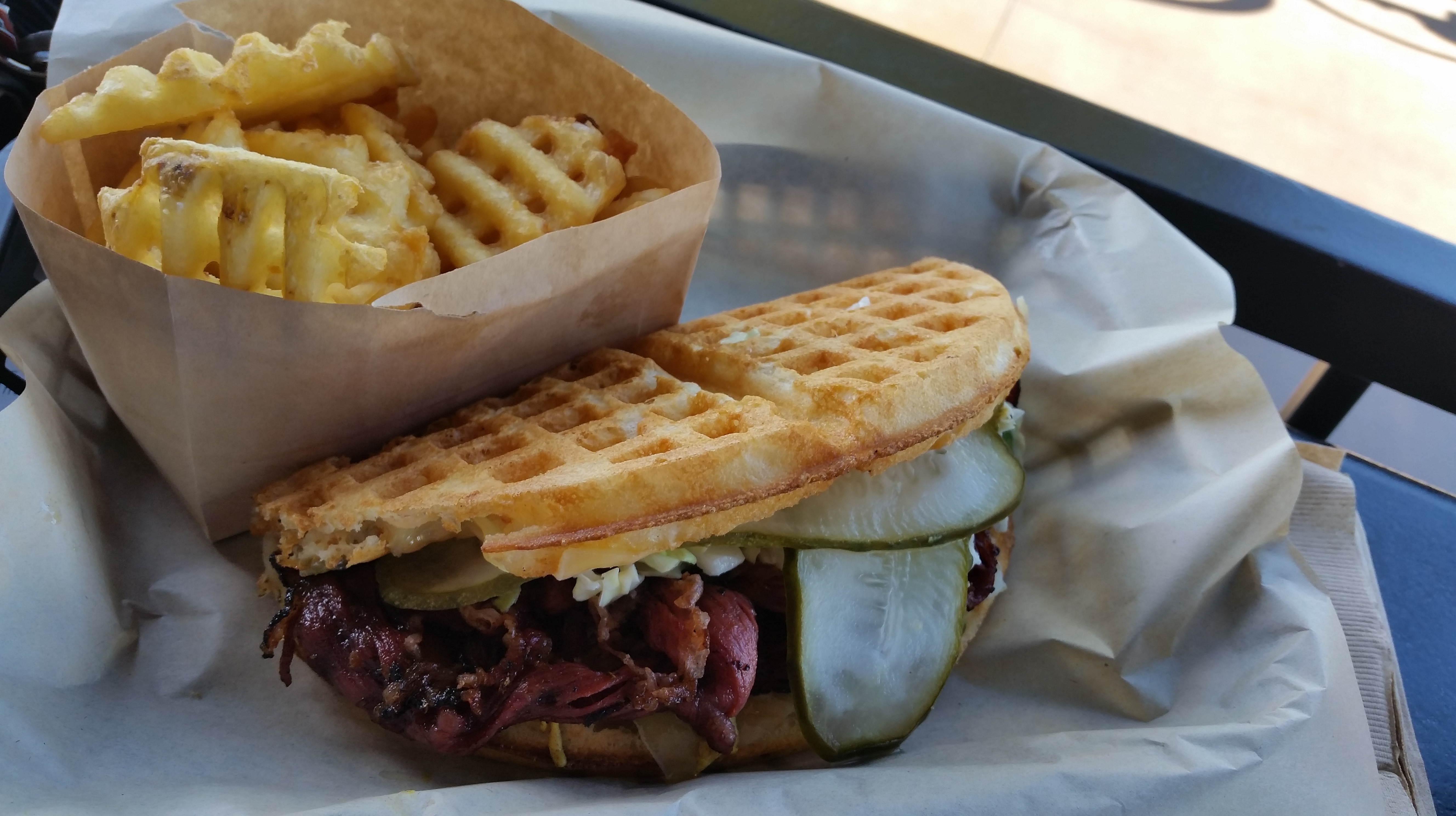 My description: Fucking Delicious! I even added a small order of fresh criss-cut fries and an unsweetened brewed iced tea. The pastrami was juicy and tender, mixed with the spicy mustard and the cider slaw was perfection. My mouth was flooded with such savory flavors with each bite. My only “gripe” is that the waffle itself was ‘hard’. Not hard as in stale – but with each bite, the waffle would tear up the roof of my mouth. But that aside – it was tasty.