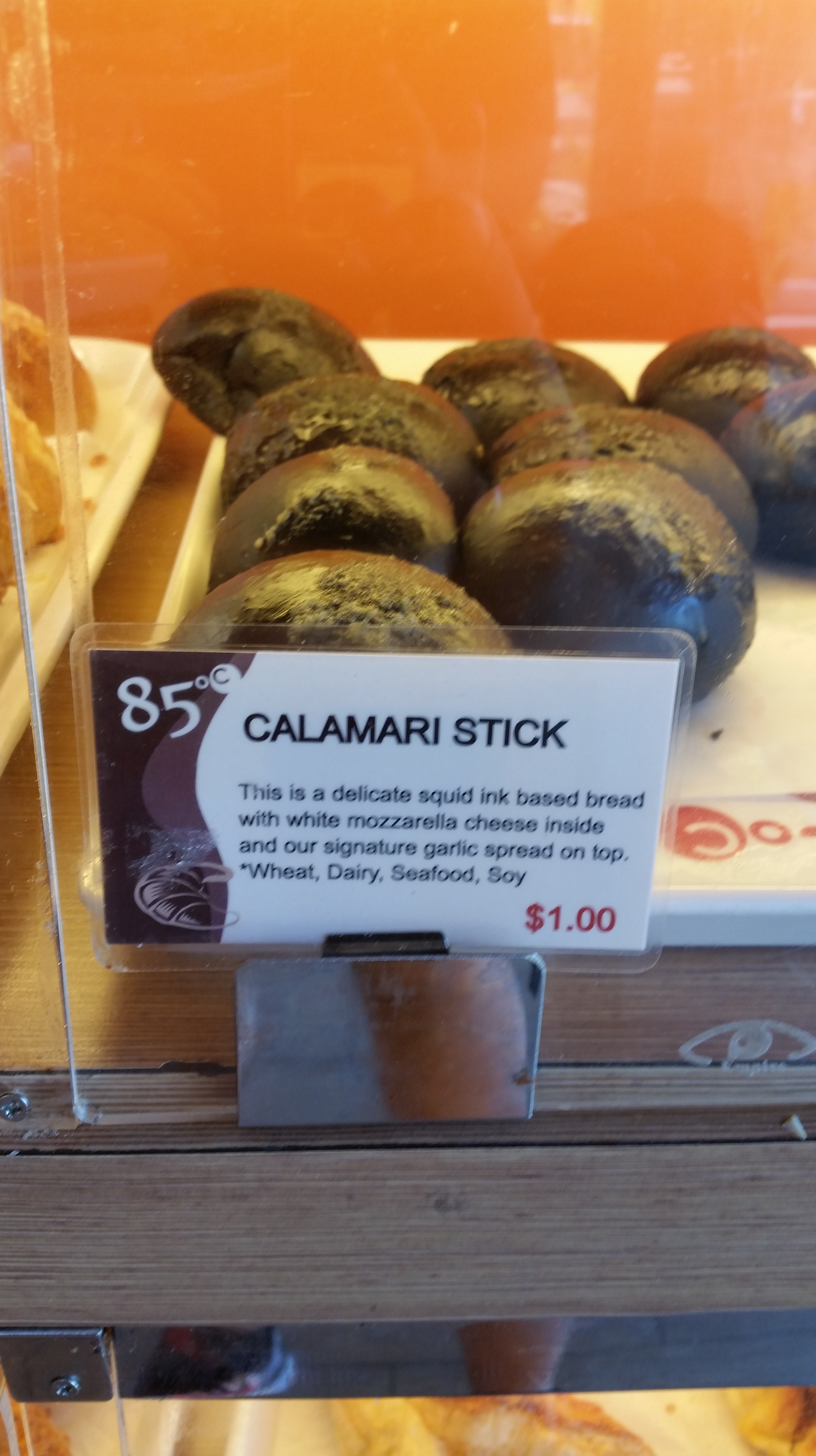 Now before you start to gag yourself – hear me out on this one. For those who’ve never had anything with squid ink, let me tell you that there isn’t any fishy or ‘sea’ flavor at all. I used to use squid ink linguine at the Italian restaurant I worked for and there isn’t any distinct flavor difference. This item is a savory bread that uses squid ink in the dough that gives it the black appearance. It is topped with a garlic butter spread and filled with melted mozzarella cheese. And at only $1 a piece – it’s definitely a great deal! I personally recommend this one!