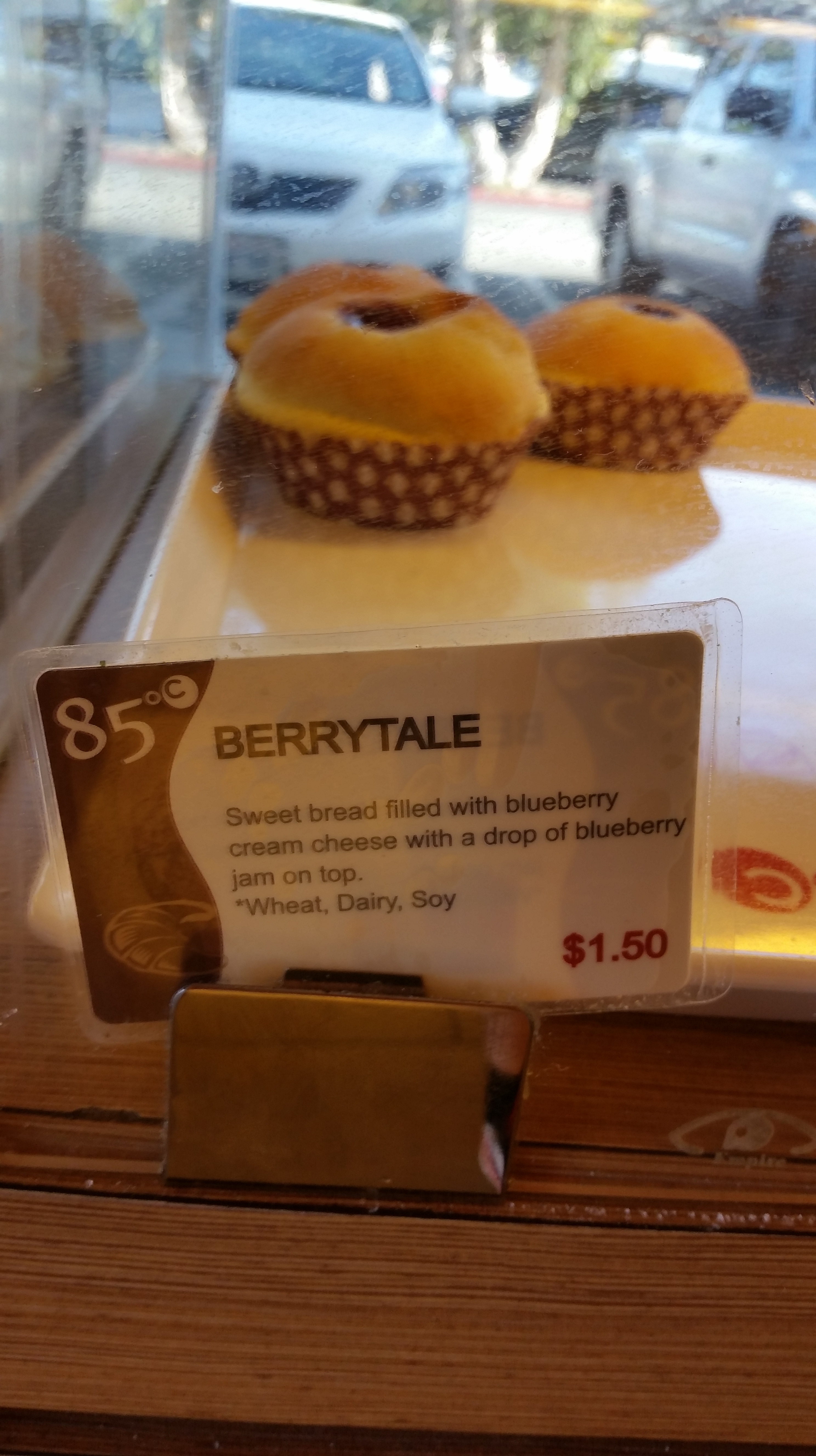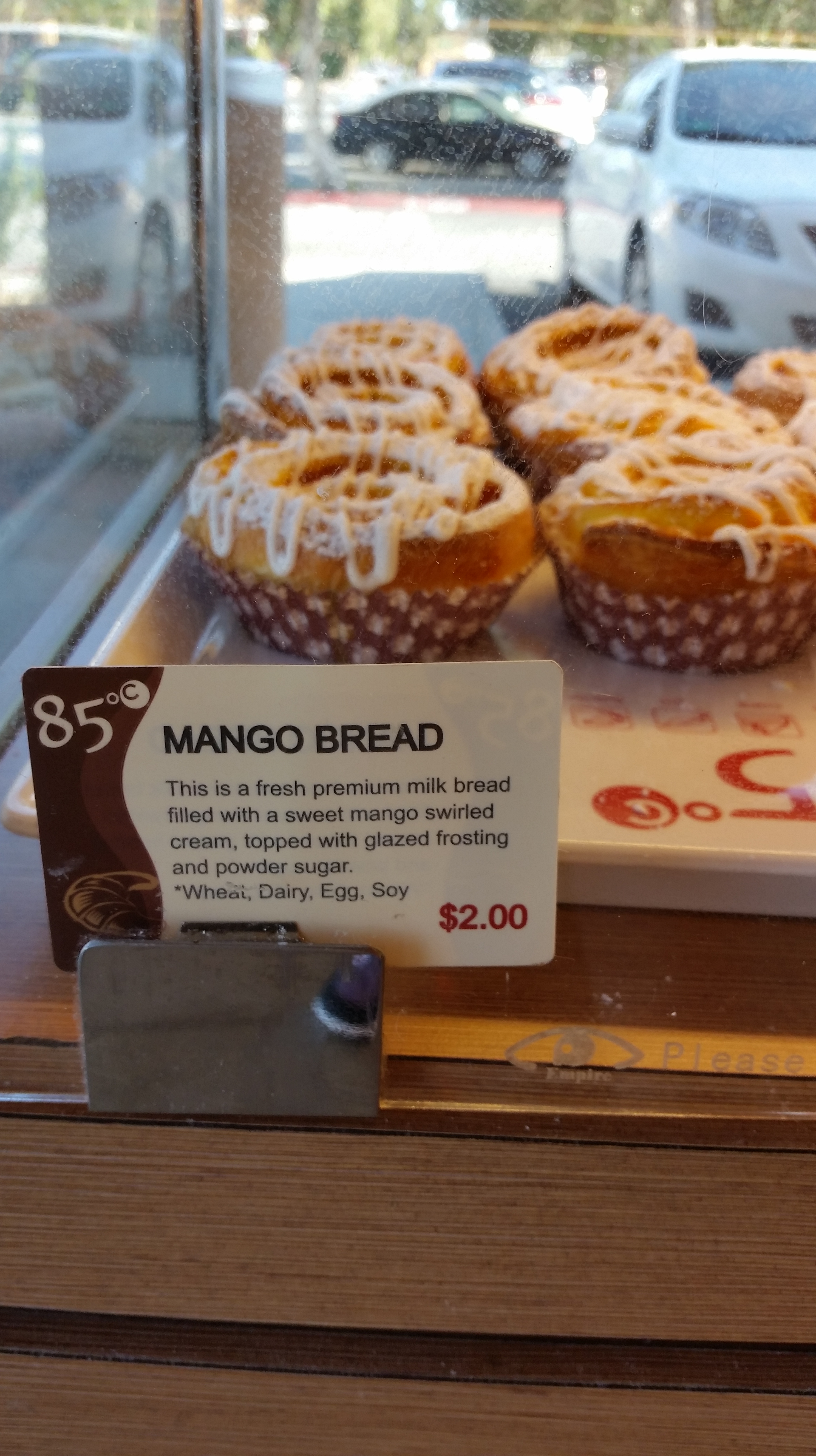 When I pulled up to the store front, I was “greeted” by large glass windows that covered the entire front of the location. Walking inside, I noticed it was airy and had a open floor plan. To the right, displays of sweet and savory breads. To the left was ample seating. Towards the rear, they have a huge display of sweet desserts. They also serve iced coffees and boba.