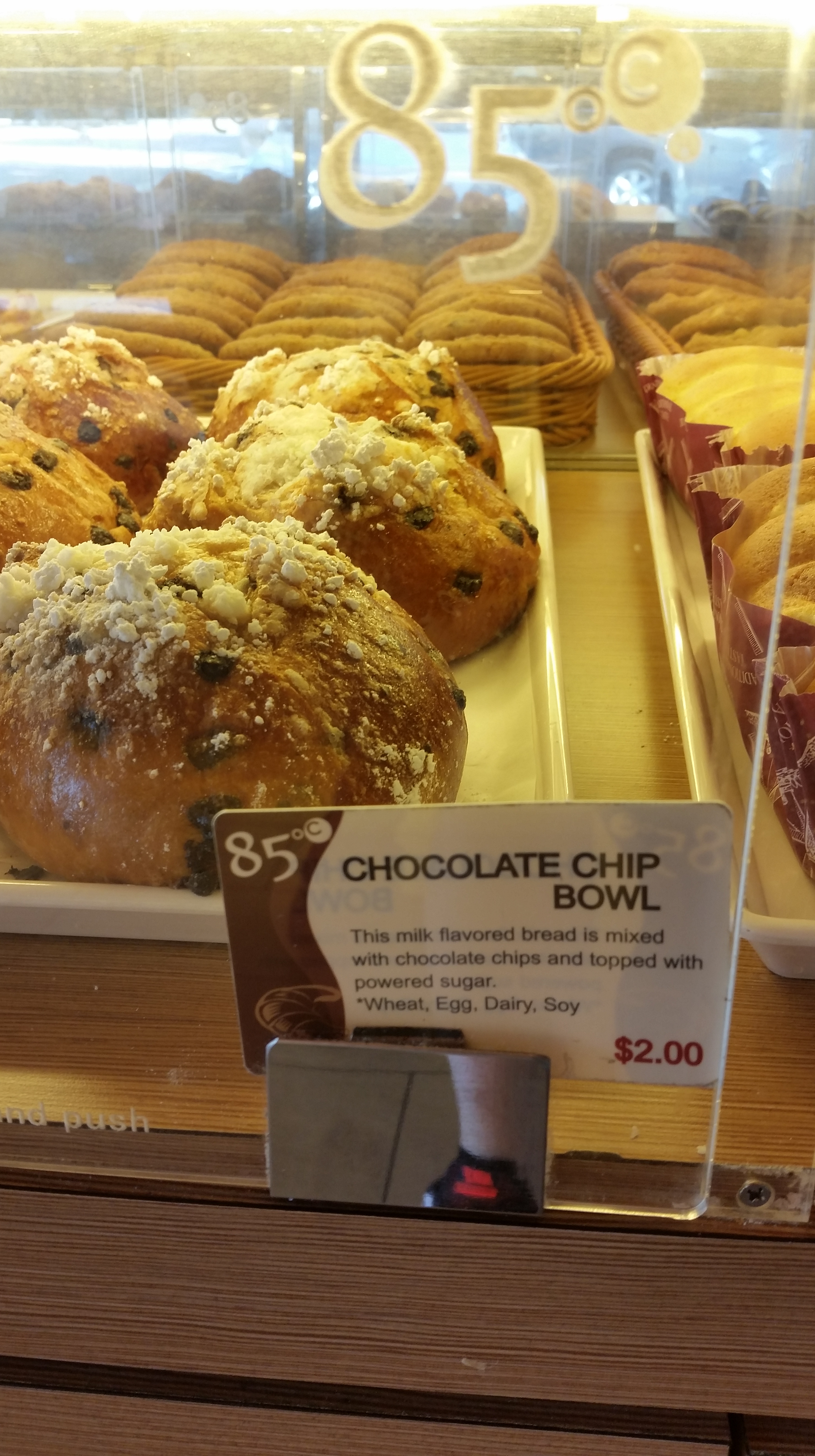 Holy mother of goodness! This GIANT sweet bread was a bit dense (the dough is mixed with milk) but very tasty. The melty (is melty a word?) chocolate chips were sweet! I used a knife to cut this into smaller bite sized pieces. Another recommendation – and at a $2 price point, this could surely feed you and a friend.